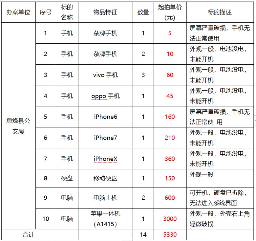 該批標(biāo)的包含各類品牌手機(jī)10部;電腦主機(jī)2臺(tái);蘋果一體機(jī)1臺(tái);移動(dòng)硬盤1個(gè)。