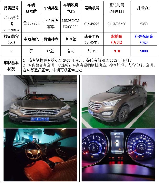拍品編號2:北京現(xiàn)代牌BH6470MBY小型普通客車一輛