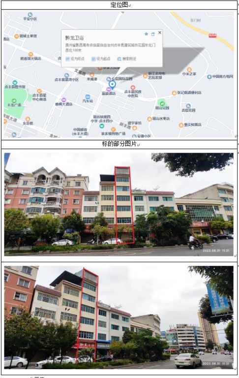 標(biāo)的位于貞豐縣龍場(chǎng)鎮(zhèn)興龍商貿(mào)區(qū),房屋總層數(shù)為6層。產(chǎn)權(quán)證號(hào):貞房權(quán)證龍場(chǎng)鎮(zhèn)字第20120349號(hào)、貞國用2012第004022號(hào),房屋證載建筑面積2278.03㎡(實(shí)測(cè)面積2263.59㎡),其中商用建筑面積:1818.71㎡,住宅建筑面積:459.32㎡;規(guī)劃用途為商住,混合結(jié)構(gòu)。證載土地面積1152㎡(實(shí)測(cè)面積1183.74㎡),地類用途為商住,使用權(quán)類型為出讓,土地使用權(quán)終止日期為2058年9月6日。