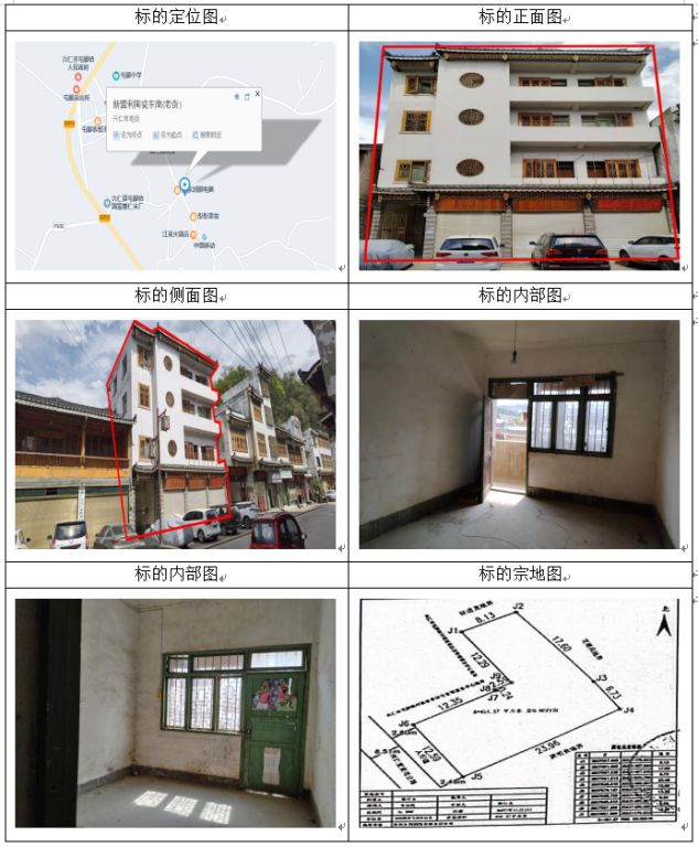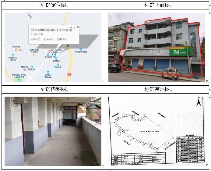 標(biāo)的坐落于貴州省興仁市百德鎮(zhèn)街上,房屋總層數(shù)4,所在層數(shù):1-4層,共有宗地面積570.6㎡,房屋建筑面積:346.95㎡,房屋結(jié)構(gòu):混合結(jié)構(gòu),房屋產(chǎn)權(quán)證號(hào):黔(2023)興仁市不動(dòng)產(chǎn)權(quán)第0005286號(hào),權(quán)利類型:國(guó)有建設(shè)用地使用權(quán)/房屋所有權(quán),權(quán)利性質(zhì):出讓/自建房,用途:商務(wù)金融用地/辦公,使用期限:2014年3月31日起2052年9月28日止。