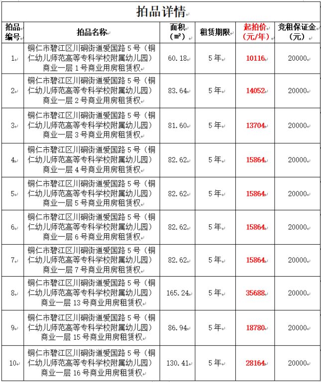 8、銅仁市碧江區(qū)川硐街道愛國路5號(銅仁幼兒師范高等專科學(xué)校附屬幼兒園)商業(yè)一層13號商業(yè)用房租賃權(quán),面積165.24㎡,租賃期限5年,起拍價:35688/年,競租保證金:2萬元;