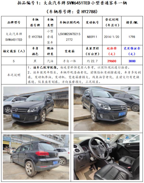 拍品編號(hào)1:大眾汽車牌SVW6451TED小型普通客車一輛(車輛原號(hào)牌:貴HY2788);