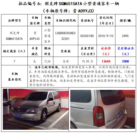 拍品編號(hào)6:別克牌SGM6515ATA小型普通客車一輛(車輛原號(hào)牌:貴A09YJ3);