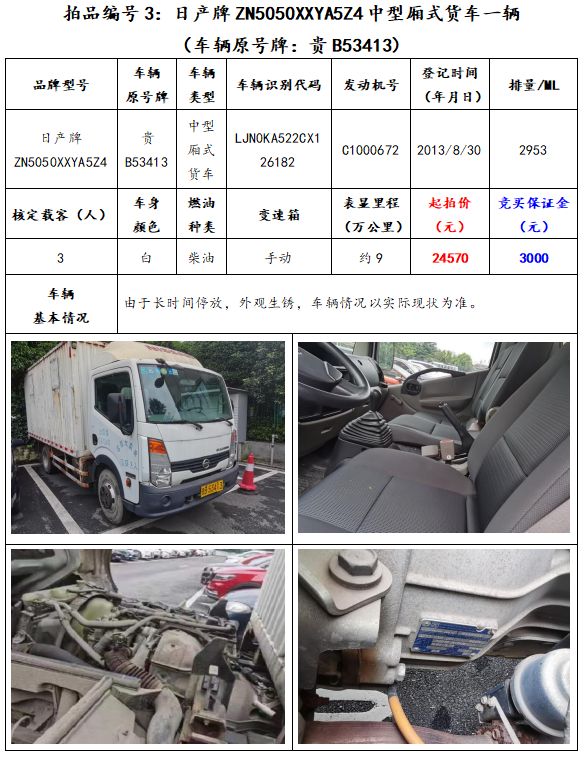 拍品編號(hào)3:日產(chǎn)牌ZN5050XXYA5Z4中型廂式貨車一輛(車輛原號(hào)牌:貴B53413);