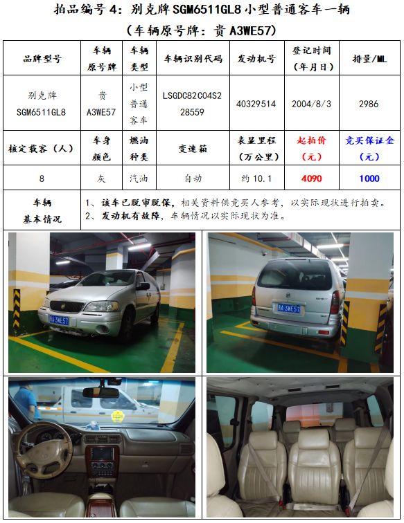 拍品編號(hào)4:別克牌SGM6511GL8小型普通客車一輛(車輛原號(hào)牌:貴A3WE57);
