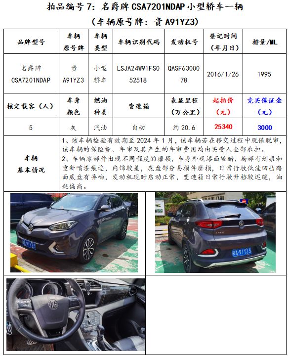 拍品編號(hào)7:名爵牌CSA7201NDAP小型轎車一輛(車輛原號(hào)牌:貴A91YZ3);