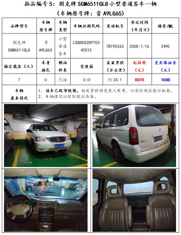 拍品編號(hào)5:別克牌SGM6511GL8小型普通客車一輛(車輛原號(hào)牌:貴A9LG65);