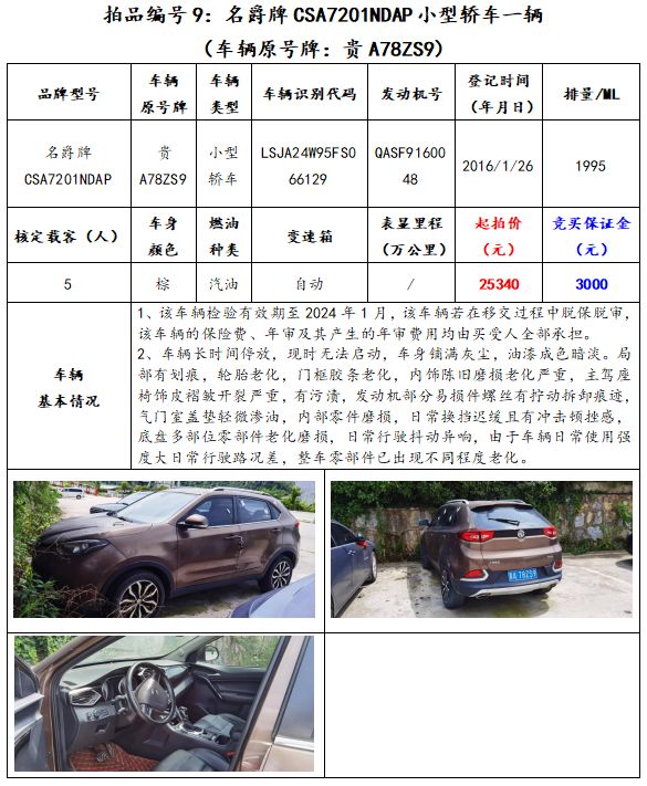 拍品編號(hào)9:名爵牌CSA7201NDAP小型轎車一輛(車輛原號(hào)牌:貴A78ZS9)。