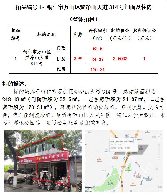 一、銅仁市萬(wàn)山區(qū)梵凈山大道314號(hào)門(mén)面及住房3年租賃權(quán)建筑面積:248.18);