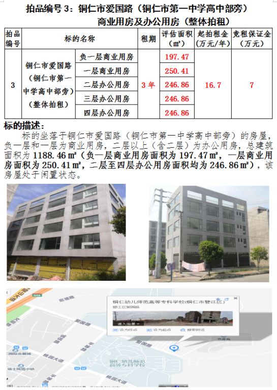 三、銅仁市愛(ài)國(guó)路(銅仁市第一中學(xué)高中部旁)負(fù)一層至四層商業(yè)用房及辦公用房3年租賃權(quán)建筑面積1188.46㎡);