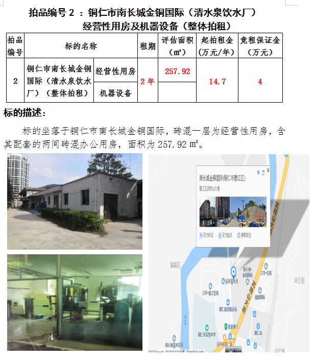 二、銅仁市南長(zhǎng)城金銅國(guó)際(清水泉飲水廠)經(jīng)營(yíng)性用房及機(jī)器設(shè)備2年租賃權(quán)(建筑面積:257.92㎡);
