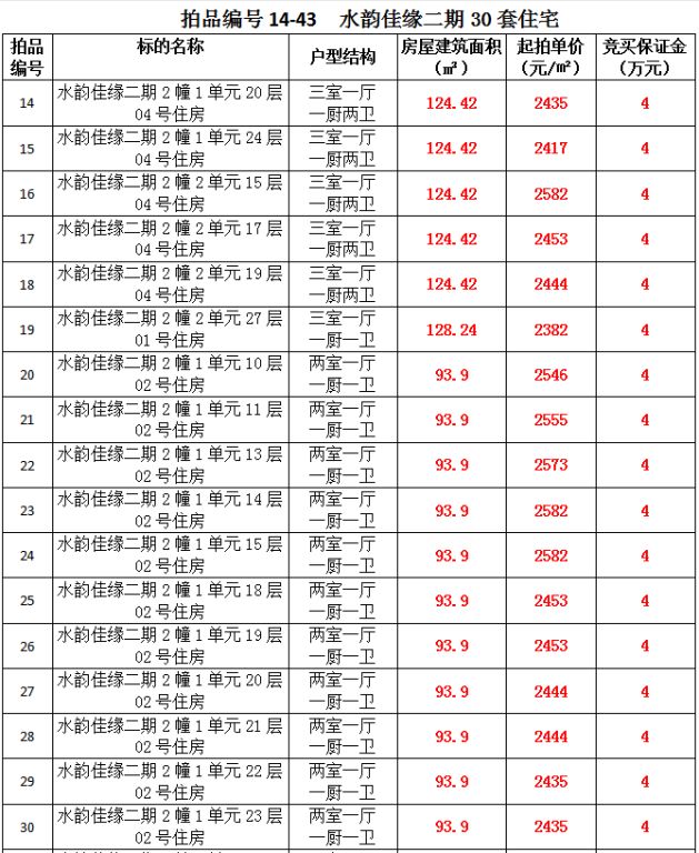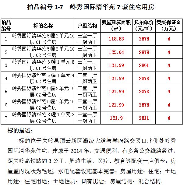 1、關(guān)嶺縣嶺秀國(guó)際7套住宅房產(chǎn),建筑面積:118.88—125.04㎡,起拍價(jià):2811—2878元/㎡;水韻佳緣30套住宅房產(chǎn),建筑面積:87.45—124.42㎡,起拍價(jià):2382—2582元/㎡;倚山花園6套住宅房產(chǎn),建筑面積:110.99—127.72㎡,起拍價(jià):2142元/㎡;