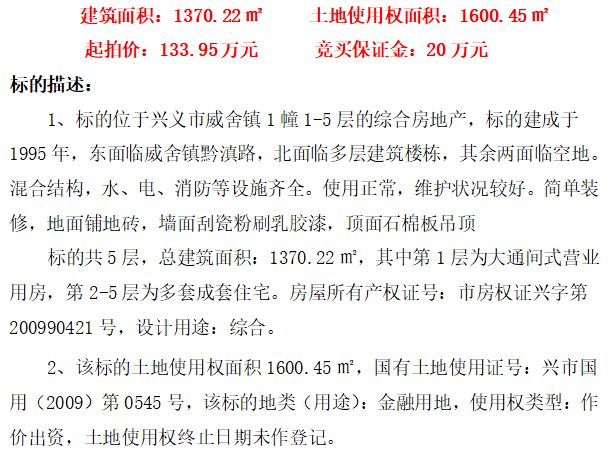 二、興義威舍支行營業(yè)用房及土地,建筑面積1370.22㎡,土地使用權面積1600.45㎡;