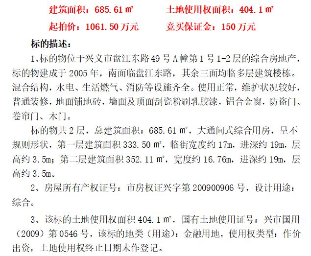 拍品編號2:興義威舍支行營業(yè)用房及土地