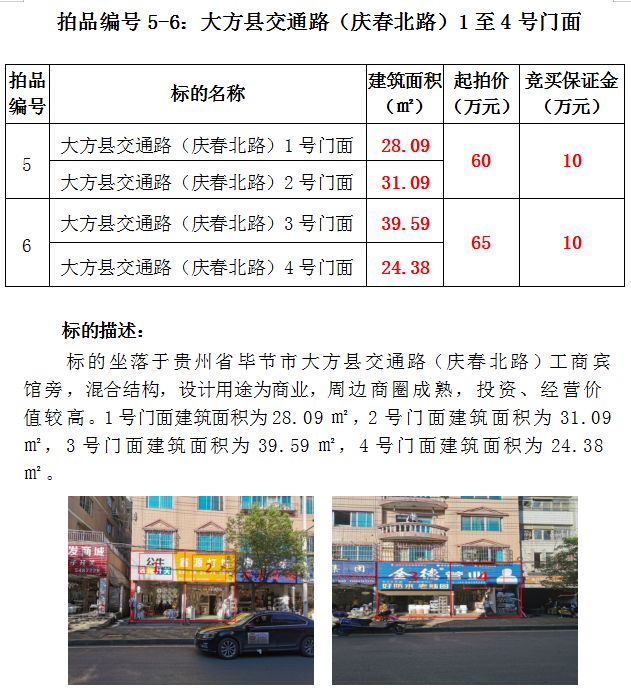 5、大方縣交通路(慶北春路)4間門面(建筑面積分別為:28.09㎡、31.09㎡、39.59㎡、24.38㎡);