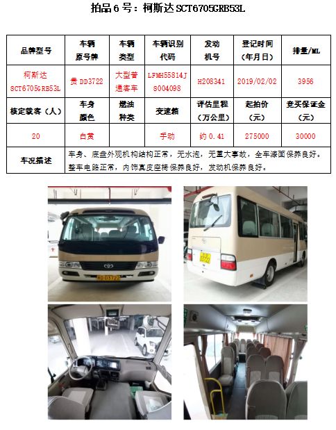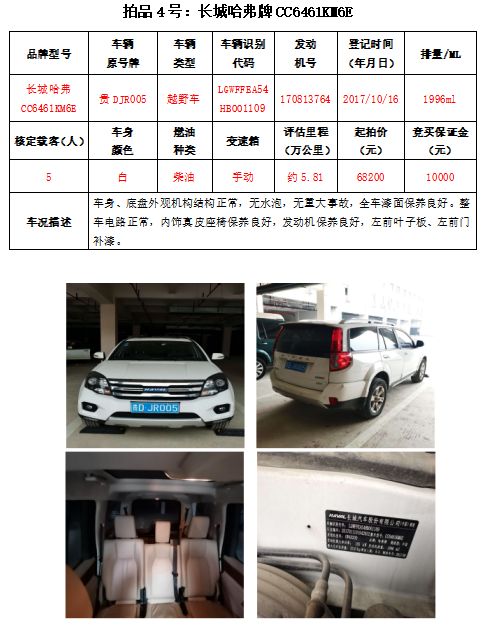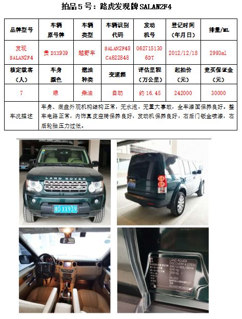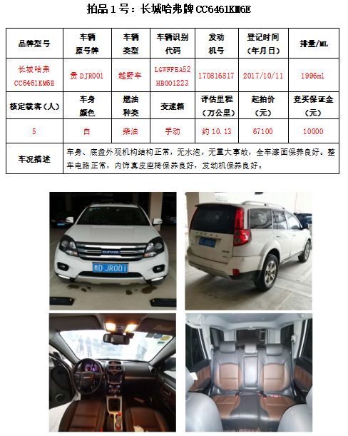 受銅仁北站客運(yùn)有限公司委托,本公司定于2020年11月27日(星期五)下午14:30時(shí),在銅仁市碧江區(qū)川硐教育園區(qū)誠(chéng)信路銅仁市公共資源交易中心開(kāi)標(biāo)六室(拍賣大廳)公開(kāi)拍賣:長(zhǎng)城哈弗(越野車4輛)、路虎發(fā)現(xiàn)(越野車1輛)、柯斯達(dá)(大型普通客車1輛)共計(jì)6輛車。