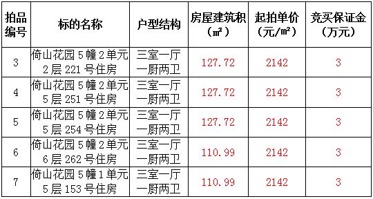 3、倚山花園5套住宅房產(chǎn),建筑面積:110.99—127.72㎡,起拍價(jià):2142元/㎡;