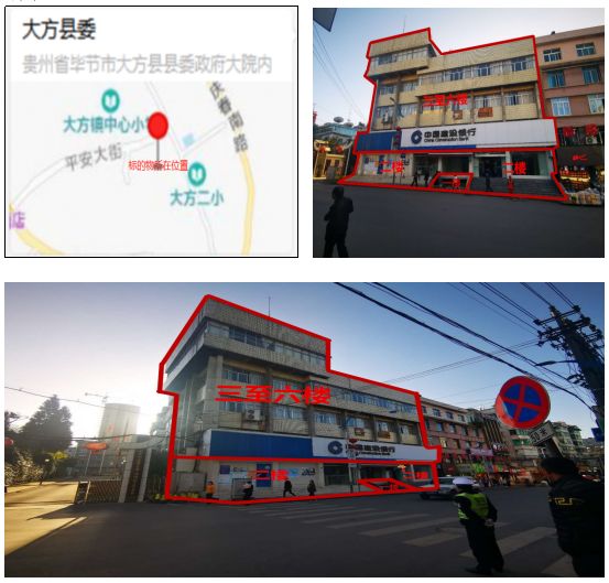 標(biāo)的物位于畢節(jié)市大方縣大方鎮(zhèn)南街1層至6層,總建筑面積:1479.43㎡,其中:1層建筑面積為222.97㎡,2層建筑面積為284.43㎡,3至6層建筑面積為972.03㎡,房屋所有權(quán)證號(hào):方房權(quán)證2005字第370609722號(hào);用地面積:267.84㎡;建筑結(jié)構(gòu):混合結(jié)構(gòu);用途:辦公用地;總樓層:共6層;使用權(quán)類型:出讓;土地終止日期:2035年8月。