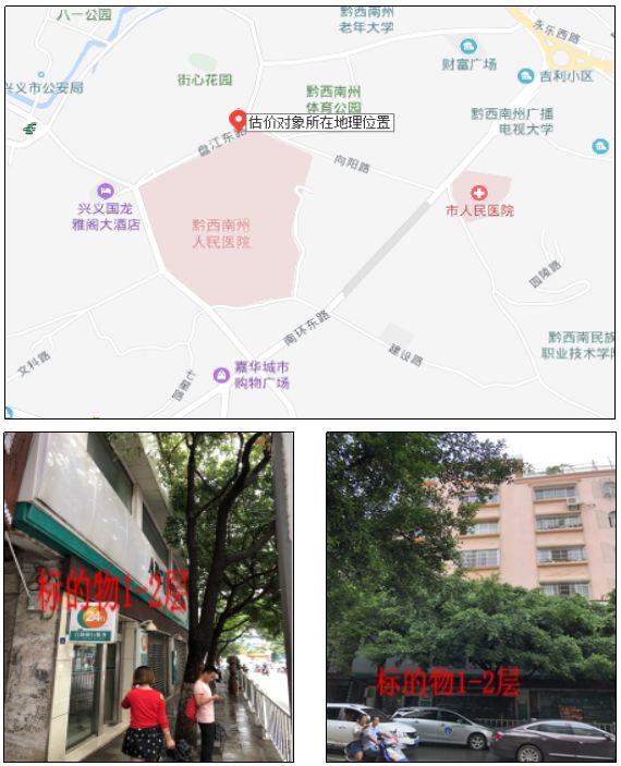 1、標的物位于興義市盤江東路49號A幢第1號1-2層的綜合房地產(chǎn),標的物建成于2005年,南面臨盤江東路,其余三面均臨多層建筑樓棟?;旌辖Y(jié)構(gòu),水電、生活燃氣、消防等設施齊全。使用正常,維護狀況較好,普通裝修,地面鋪地磚,墻面及頂面刮瓷粉刷乳膠漆,鋁合金窗,防盜門、卷簾門、木門。