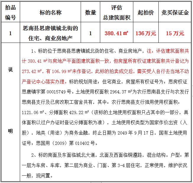 1、思南縣思唐鎮(zhèn)城北街的住宅、商業(yè)房地產(chǎn),建筑面積共:380.41㎡;起拍價(jià):136萬(wàn)元;競(jìng)買(mǎi)保證金15萬(wàn)元。
