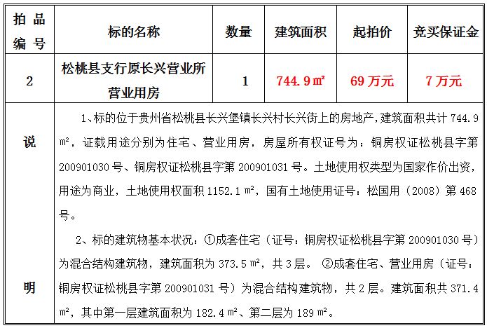 2、松桃縣支行原長(zhǎng)興營(yíng)業(yè)所營(yíng)業(yè)用房,建筑面積共:744.9㎡;起拍價(jià):69萬(wàn)元;競(jìng)買(mǎi)保證金:7萬(wàn)元。