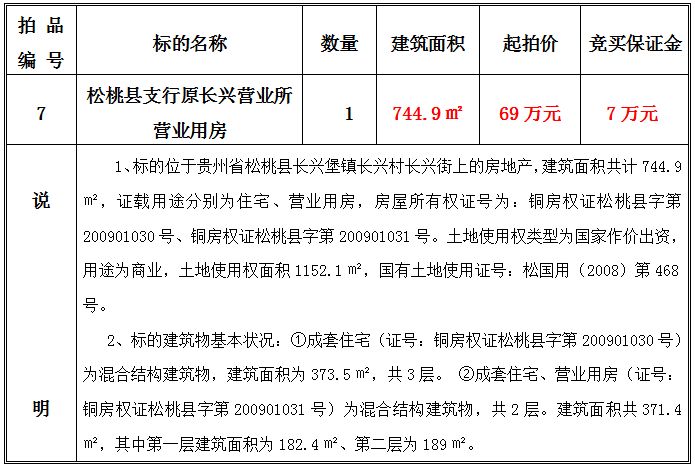 3、松桃縣支行原長興營業(yè)所營業(yè)用房,建筑面積共:744.9㎡;起拍價:69萬元;競買保證金:7萬元。