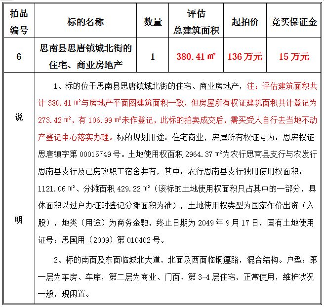 2、思南縣思唐鎮(zhèn)城北街的住宅、商業(yè)房地產(chǎn),建筑面積共:380.41㎡;起拍價:136萬元;競買保證金15萬元。