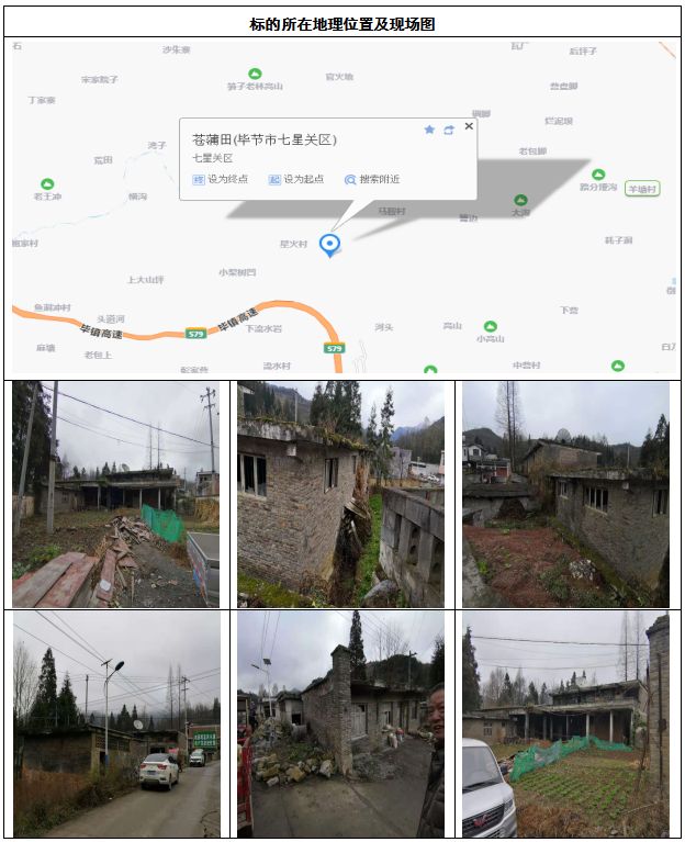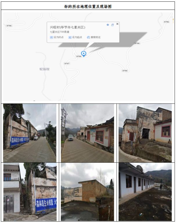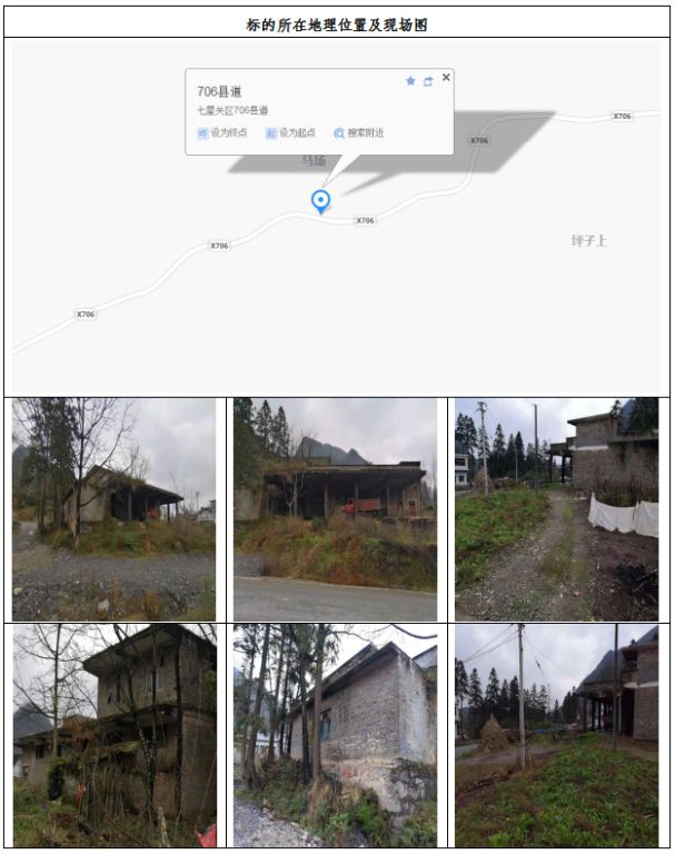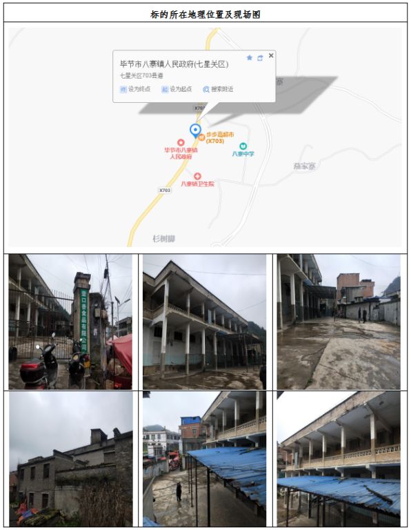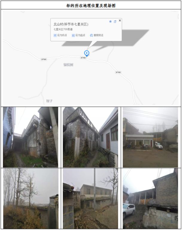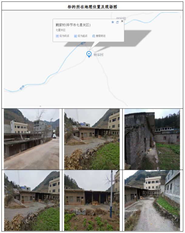 標(biāo)的位于畢節(jié)市七星關(guān)區(qū)水箐鎮(zhèn)星火村,房屋總層數(shù)二層,建成于1996年。總建筑面積:858.63㎡,其中套內(nèi)建筑面積:793.45㎡,共有分?jǐn)偯娣e:65.18㎡;土地面積:1320.84㎡,磚混結(jié)構(gòu),無房產(chǎn)證,國有土地使用證:畢市國用(99)字第3-002號(hào),用途為:倉庫,土地性質(zhì)為:劃撥用地。