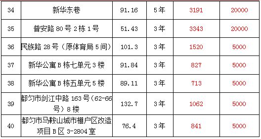 2、都勻市大十字三角巷、西苑小區(qū)、新汽車站對面、新華東巷、新華公寓、劍江中路、馬鞍山城市棚戶區(qū)、石惠公寓等10處房屋3年-5年租賃權(quán),面積約13.27㎡-221.94㎡;