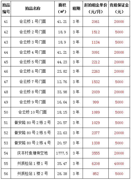 2021年1月28日下午14:00拍賣標(biāo)的共計(jì)38個(gè)標(biāo)的,其中:41—72號(hào)標(biāo)的目前均為租賃狀態(tài),如承租人參與競租,其享有同等價(jià)位優(yōu)先購買權(quán),其余73—78標(biāo)的為閑置狀態(tài)。