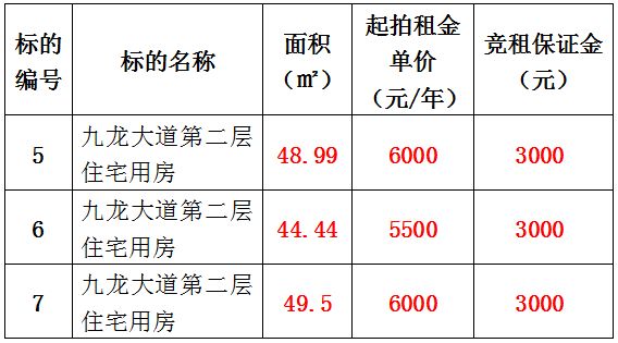 5、九龍大道第二層住宅用房1號、2號、3號,面積分別為:48.99㎡、44.44㎡、49.5㎡,租賃期均為:3年,起拍租金單價分別為:6000/年、5500/年、6000/年,競租保證金分別為:3000元;