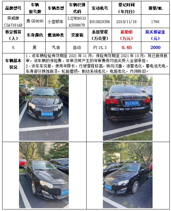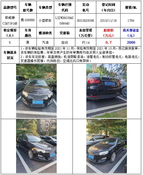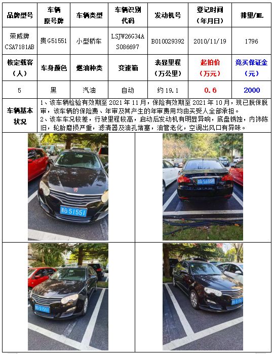 拍品編號(hào)1:榮威牌CSA7181AB小型轎車(chē)一輛