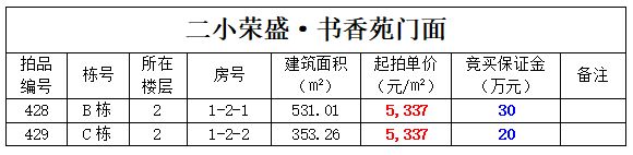 5、二小榮盛·書香苑門面2間,建筑面積:353.26—531.01㎡,起拍單價:5337元/㎡;
