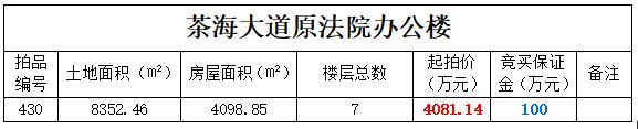 6、茶海大道原法院辦公樓,土地面積:8352.46㎡,房屋面積:4098.85㎡,起拍價:4081.14萬元;