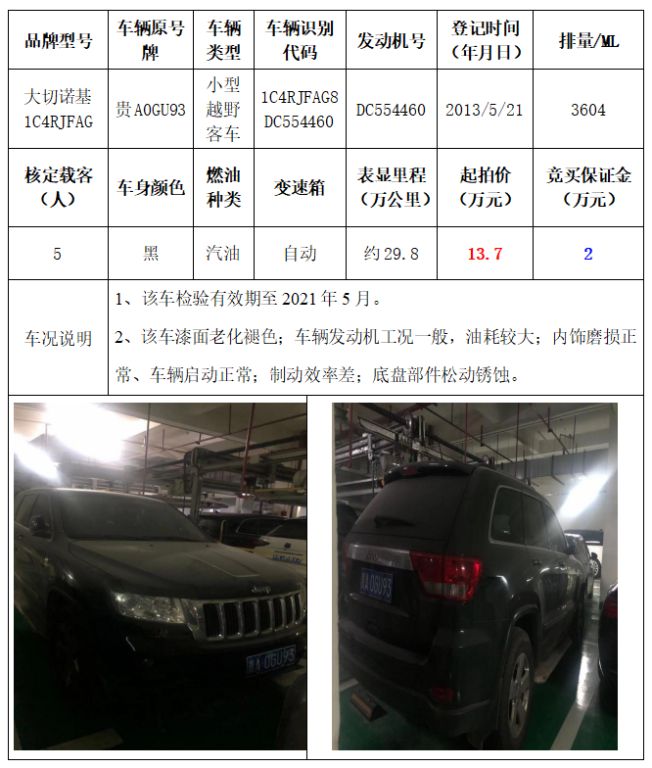 拍品編號(hào)1:大切諾基1C4RJFAG小型越野客車(原號(hào)牌貴A0GU93)一輛