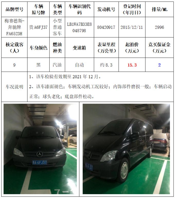 拍品編號(hào)2:梅賽德斯-奔馳牌FA6523H小型普通客車(原號(hào)牌貴A6FJ37)一輛