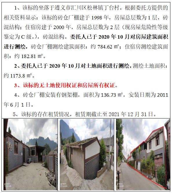 5、松林站丁臺點磚倉廠棚、住宿房,測繪建筑總面積:約967.43㎡,測繪土地面積:約1173.8㎡,起拍價:10.5萬元;