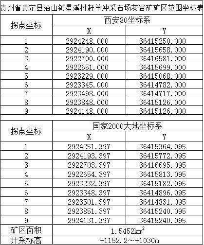 拍賣采礦權(quán)名稱貴定縣沿山鎮(zhèn)星溪村趕羊沖采石場灰?guī)r礦采礦權(quán),根據(jù)國土部門批準(zhǔn)劃定的礦區(qū)范圍,礦區(qū)面積為1.5452平方千米,開采標(biāo)高+1152.2~+1030米,礦區(qū)拐點(diǎn)坐標(biāo)如下: