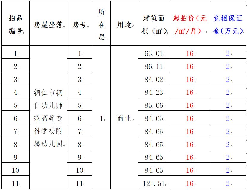 1、銅仁幼兒師范高等??茖W(xué)校附屬幼兒園一層111號商業(yè)房地產(chǎn)11間門面拍租,建筑面積:63.01-125.51㎡,拍租經(jīng)營期限:5年,起拍價:16//月;