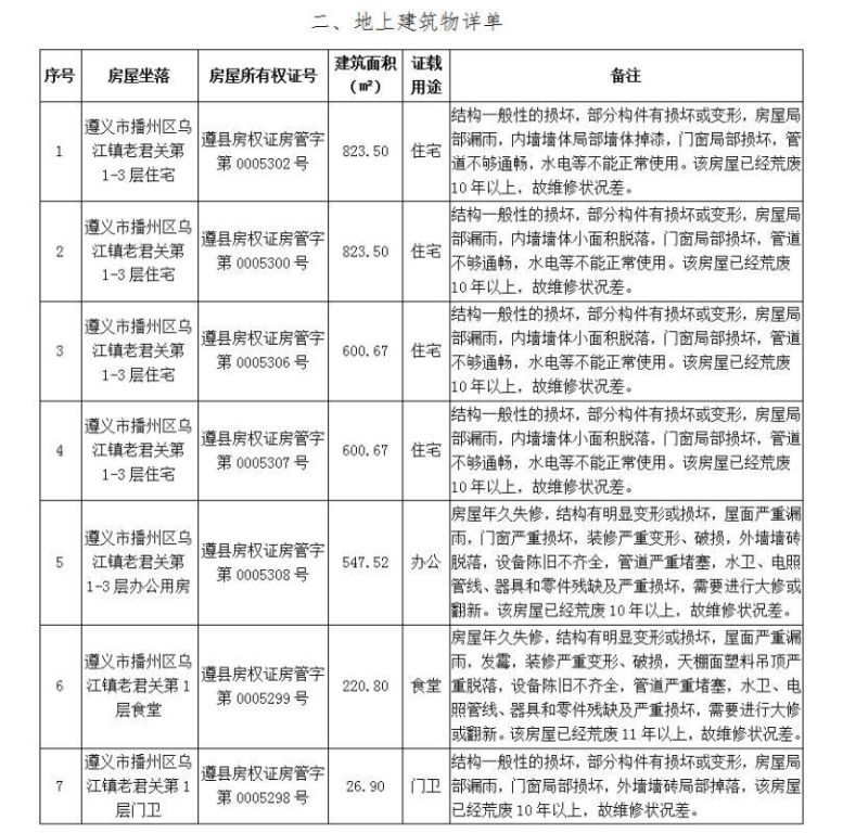遵義市播州區(qū)烏江鎮(zhèn)老君關(guān)三宗工業(yè)用地及地上住宅、辦公、食堂、門(mén)衛(wèi)用房等房地產(chǎn)(土地使用權(quán)總面積41953.96㎡,總建筑面積3643.56㎡)