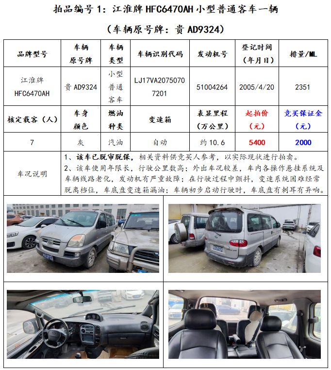 拍品編號1:江淮牌HFC6470AH小型普通客車一輛(車輛原號牌:貴AD9324);