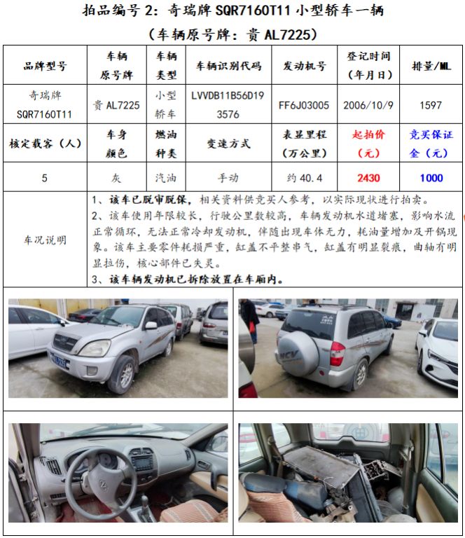 拍品編號2:奇瑞牌SQR7160T11小型轎車一輛(車輛原號牌:貴AL7225);