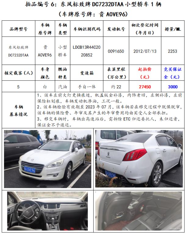 拍品編號6:東風(fēng)標(biāo)致牌DC7232DTAA小型轎車1輛(車牌原號牌:貴A0VE96);