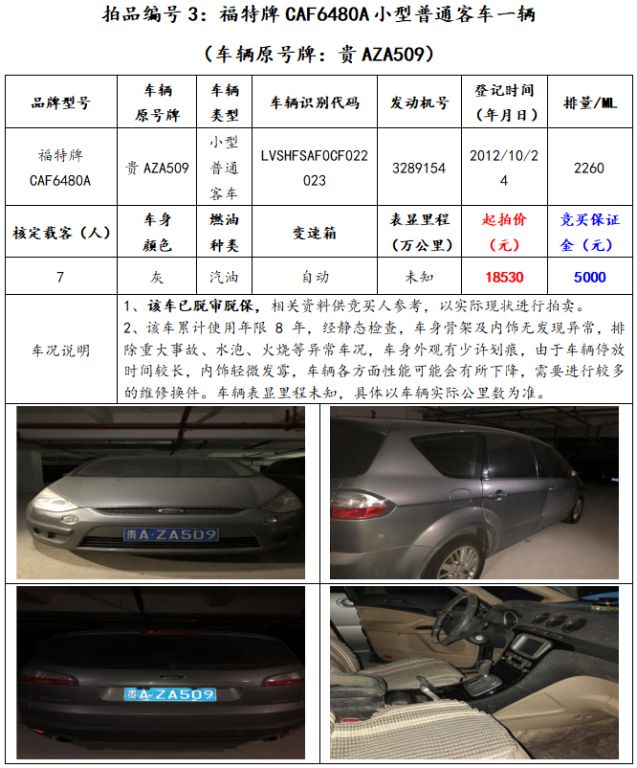 拍品編號3:福特牌CAF6480A小型普通客車一輛(車輛原號牌:貴AZA509);