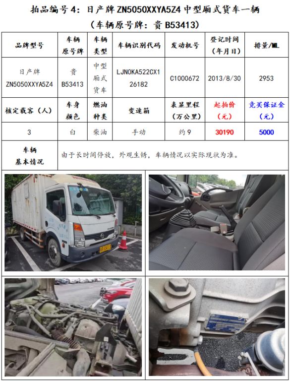 拍品編號4:日產(chǎn)牌ZN5050XXYA5Z4中型廂式貨車一輛(車輛原號牌:貴B53413);