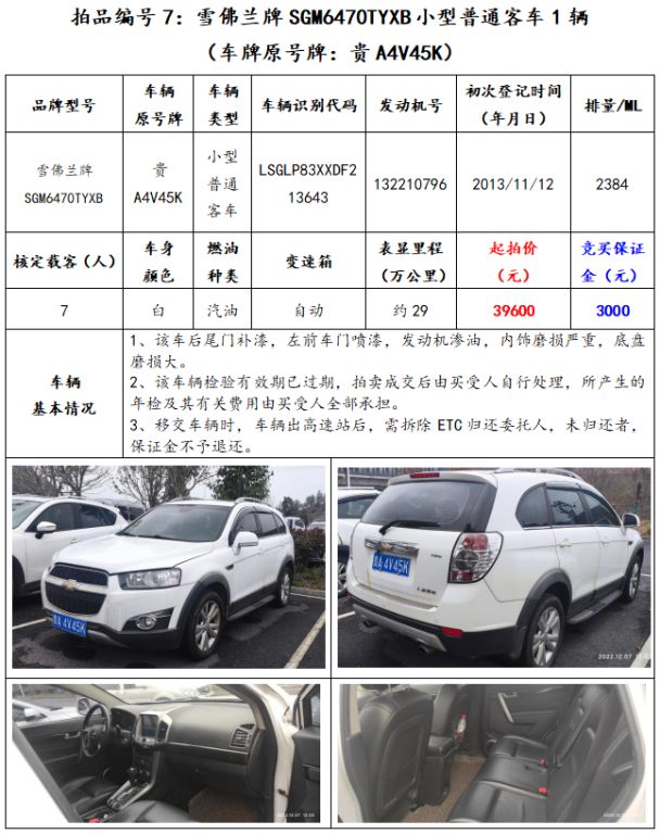 拍品編號7:雪佛蘭牌SGM6470TYXB小型普通客車1輛(車牌原號牌:貴A4V45K)。