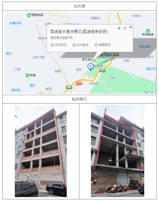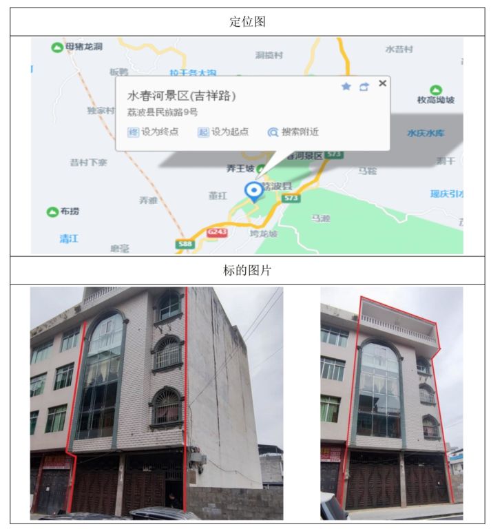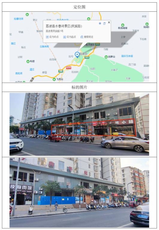 標的位于玉屏鎮(zhèn)民族路2號,房屋建筑面積:627.65㎡,產權完整,2011年建成,房屋總層數為14層,標的所在層數為1層。不動產權證號:黔房權證荔波縣字第201300495號,土地所有權類型:出讓;土地所有權規(guī)劃用途:商業(yè)用房,建筑結構為鋼混結構。