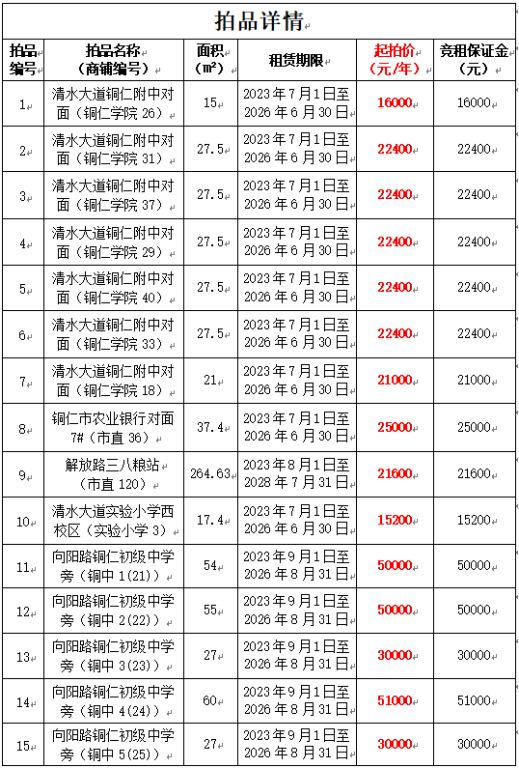 11、向陽(yáng)路銅仁初級(jí)中學(xué)旁(銅中1(21)),面積:54㎡,租賃期:2023年9月1日至2026年8月31日,起拍價(jià):50000元/年,競(jìng)租保證金:50000元;