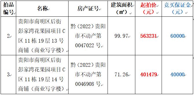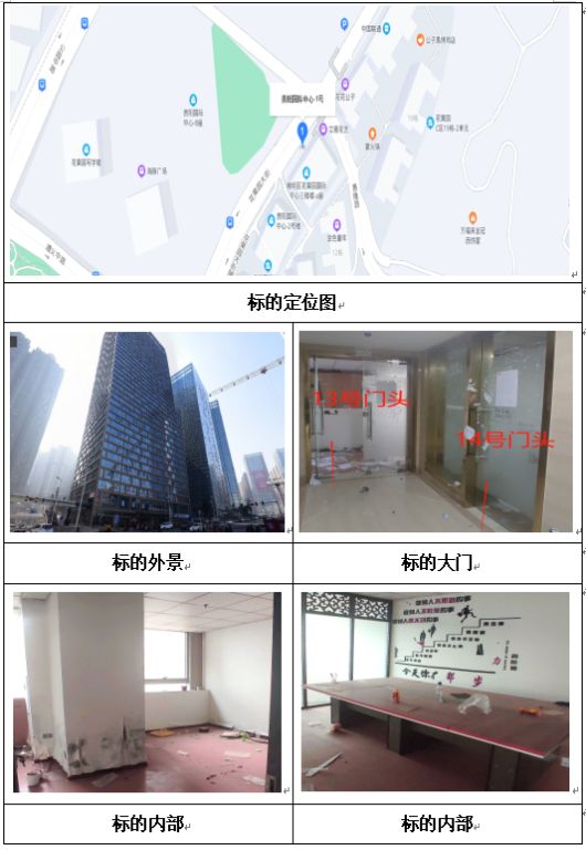 標(biāo)的位于貴陽市南明區(qū)花果園彭家灣花果園C區(qū)(貴陽國際中心1號)11棟1單元19層13號、14號花果園商鋪(商業(yè)寫字樓),其中標(biāo)的2號建筑面積為99.97㎡、套內(nèi)面積為73.48㎡;標(biāo)的3號建筑面積為71.26㎡、套內(nèi)面積為52.38㎡。房屋為一般裝修,包含水電敷設(shè)及安裝、地面地磚、墻面刷瓷粉及乳膠漆、頂面鋁扣板吊頂、玻璃門。用途為辦公,鋼混結(jié)構(gòu),建成時間為2013年8月,所在層數(shù)19層,目前均為空置狀態(tài)。
