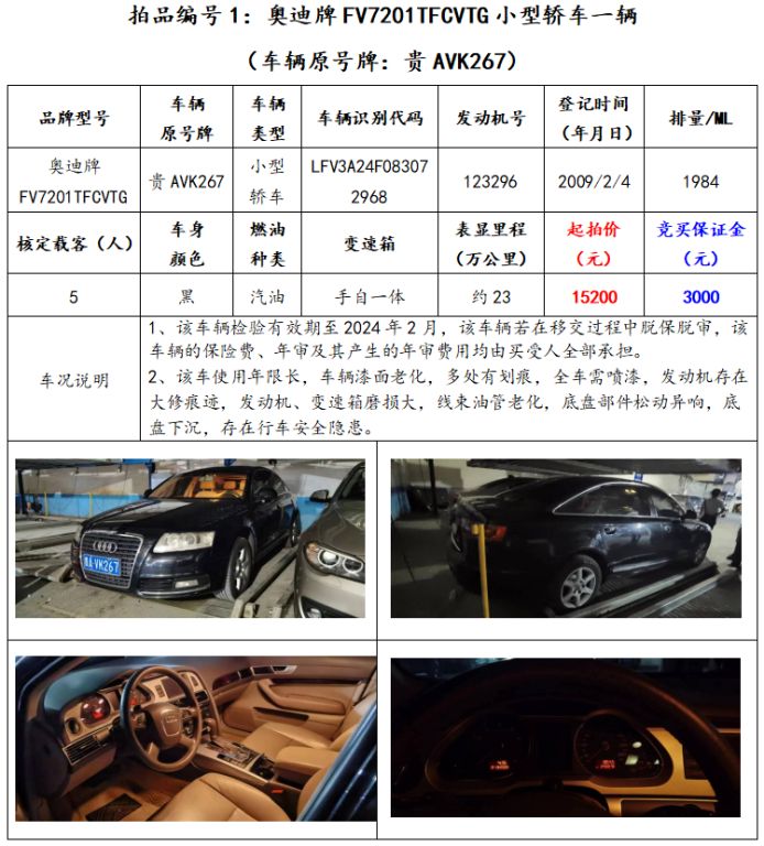拍品編號(hào)1:奧迪牌FV7201TFCVTG小型轎車一輛(車輛原號(hào)牌:貴AVK267);